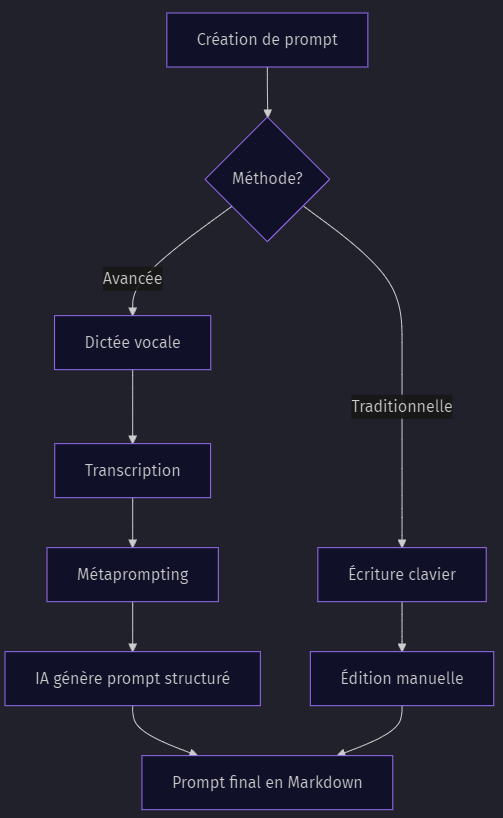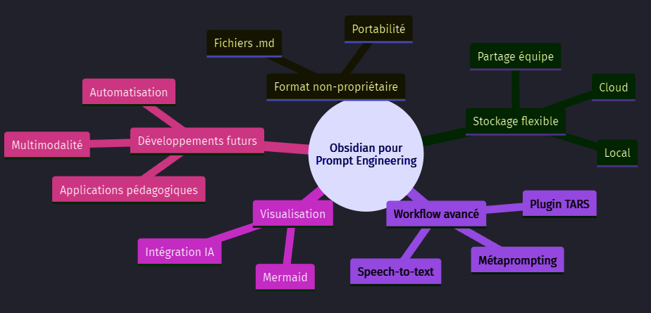 Les techniques avancées comme le métaprompting et l'utilisation de la dictée vocale, combinées avec des plugins comme TARS, transforment Obsidian en un véritable laboratoire de prompt engineering. L'intégration de visualisations via Mermaid et d'autres IA enrichit encore les possibilités, ouvrant la voie à une approche plus visuelle et intuitive de la création de prompts.